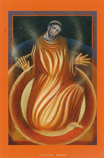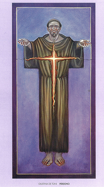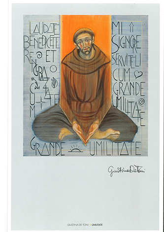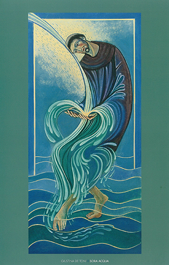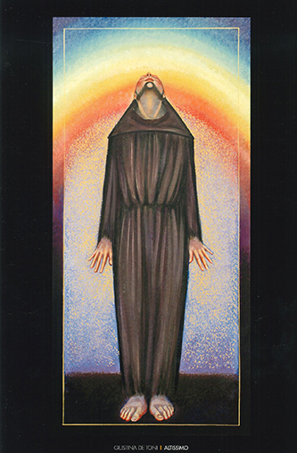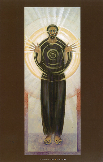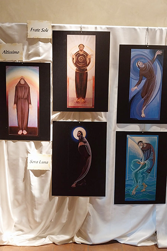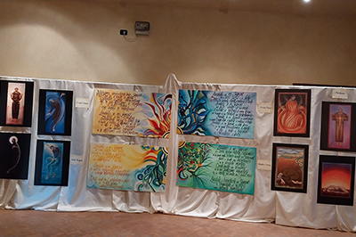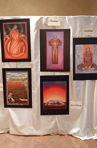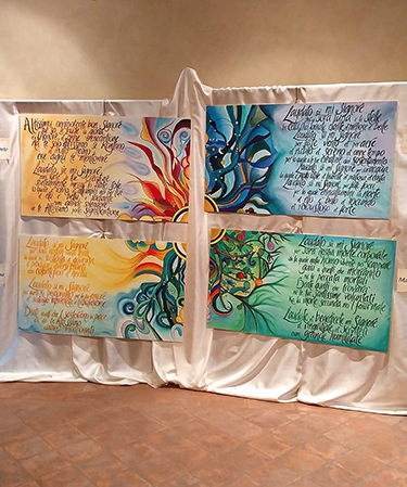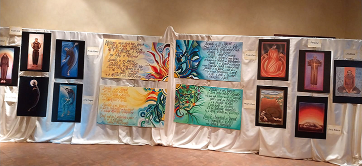 Nel ricondurre a Dio Creature e Creazione Francesco propone una fratellanza universale che gli fa chiamare tutte le creature, compresi gli esseri inanimati, “fratello e sorella”, riconoscendo a ciascuno di essere figlio/figlia di uno stesso padre. Questo ciclo pittorico intende rappresentare il Cantico delle Creature di San Francesco mettendo in risalto la relazione che connette intimamente l’universo cosmico con l’universo interiore. L’immagine di Francesco assume di volta in volta la forma dell’elemento rappresentato, liberandone forza simbolica e indicando la traccia di un percorso di integrazione umana e spirituale. Ringraziamo il Signore per questa iniziativa che ci permette di offrire una meditazione visiva a coloro che visiteranno la mostra perché attraverso Francesco possano giungere a riconoscere l’Autore di tutte le creature e a Lui restituire tutto nella lode!
