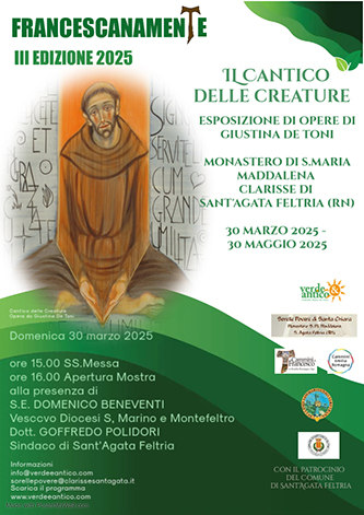 Nell’anno in cui facciamo memoria degli 800 anni dalla composizione del Cantico delle Creature di S. Francesco, prosegue il cammino di celebrazioni che, insieme all’Associazione Verde Antico e Francescanamente, vogliono far conoscere a tutti Francesco e le opere e gli eventi della sua vita. Per questo oggi si č inaugurata, nell’atrio del nostro monastero, una mostra di riproduzioni di dipinti dell’Artista Giustina de Toni, sul Cantico delle Creature, opere originariamente realizzate per il Convento di San Damiano di Assisi. Si tratta di una iniziativa che č stata patrocinata dalla pro-loco del comune di S. Agata Feltria e che ha visto la presenza del primo cittadino del nostro paese che č intervenuto con un piccolo discorso. La mostra č stata inaugurata con la benedizione del nostro Vescovo, Mons. Domenico Beneventi, al termine della messa con le famiglie della nostra diocesi presenti per il loro ritiro annuale. Presente all’inaugurazione anche l’artista Giustina de Toni che ha realizzato le opere. La mostra rimarrà visibile tutti i giorni, presso l’atrio del nostro monastero ed č un invito di San Francesco a lodare e dare gloria a Dio per le sue creature, e allo stesso tempo un invito a tutte le creature a lodare il loro Creatore.