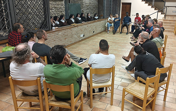 Il percorso seguirà il Cammino di San Francesco, partendo dal carcere di Rimini per giungere al monastero di La Verna. I partecipanti, tra cui persone recluse, volontari e operatori, affronteranno questa esperienza insieme, condividendo fatica, incontri e riflessioni. Il cammino vuole essere un’opportunità di riscoperta di sé stessi, attraverso il contatto con la natura, il dialogo fraterno e il silenzio interiore. Nella terza tappa di questo cammino il gruppo è giunto da S. Leo a S. Agata Feltria, presso la nostra foresteria, incontrando, nella serata, la nostra fraternità di Sorelle Povere. L’incontro con volti e storia di rinascita ci ha portati al cuore del Vangelo, là dove solo il Signore può restituire la dignità perduta e riaprire cammini di speranza e trasformazione. Siamo molto felici di poter accompagnare con la nostra preghiera e il nostro affetto questi fratelli perché il Signore possa portare a compimento quanto iniziato in ciascuno di loro.