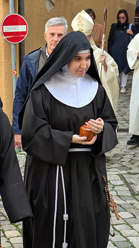 In questa giornata la nostra sorella Rita Letizia ha consegnato per sempre la sua vita al Signore di fronte alla Chiesa nella professione solenne della forma di vita delle sorelle povere di S. Chiara. Il suo sì che si radica nel sì di Cristo alla Chiesa sua sposa, ha risuonato in un'assemblea numerosissima che si è radunata per partecipare alla nostra gioia. E' una gioia grande poter accogliere per sempre Rita nella nostra fraternità perché la sua vita possa continuare ad edificare la Chiesa, come collaboratrice e sostegno delle membra di Cristo. A questa gioia si è unita la bella e numerosa famiglia di Rita, tanti amici che hanno condiviso il cammino in parrocchia di Rita e tante persone care alla fraternità e il paese tutto di S. Agata che era presente alla celebrazione anche nella persona del nostro sindaco e delle rappresentanze militari.